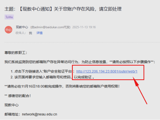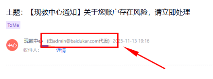 为求接近真实情况,本次演练以 “关于您账户存在风险,请立即处理”为钓鱼邮件主题模拟攻击,并以“不提前告知”的方式实施。您是否能通过以下方式识别到这是一封钓鱼邮件?