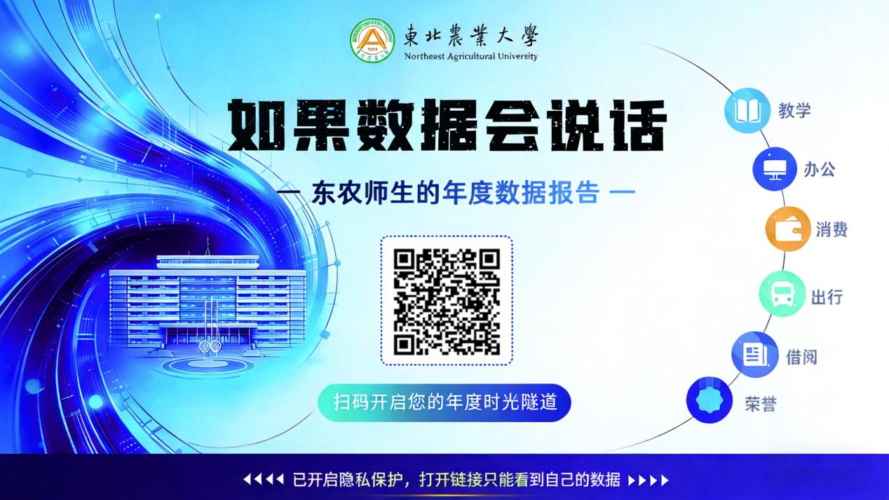 在年度倒计时之际,东农的2025年正以数智化的脉搏跳动出新时代的节奏。近日,现代教育技术中心面向全校师生正式发布“如果数据会说话——2025年度个人印记”数据报告,对全校师生一年来的教学、办公、消费、出行、借阅等多维度数据进行总结和呈现。全校师生扫描下图中的二维码,通过身份验证后即可访问。